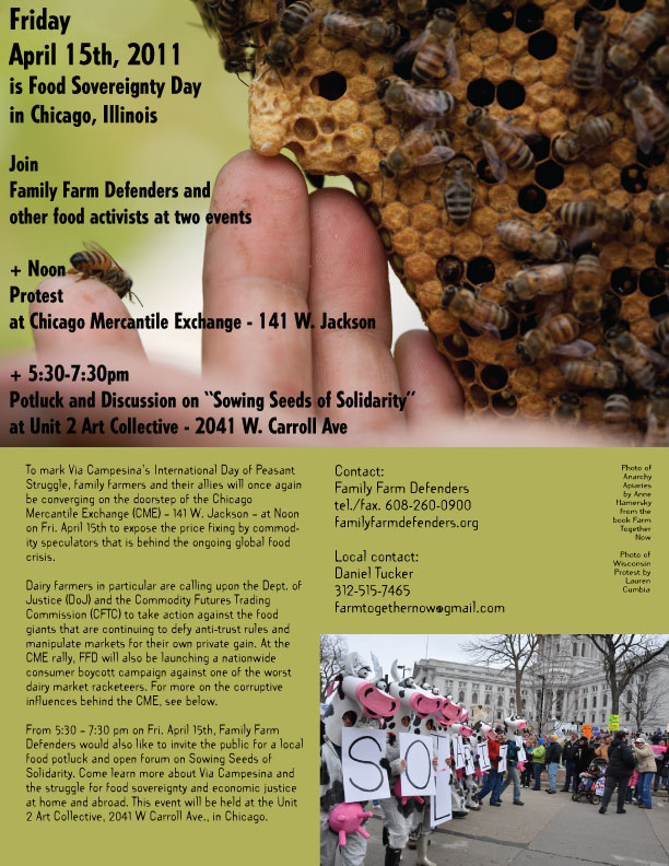 From 5:30 – 7:30 pm on Fri. April 15th, Family Farm Defenders would also like to invite the public for a local food potluck and open forum on Sowing Seeds of Solidarity. Come learn more about Via Campesina and the struggle for food sovereignty and economic justice at home and abroad. This event will be held at the Unit 2 Art Collective, 2041 W Carroll Ave., in Chicago.