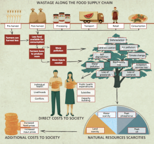 This flow chart from the FAO study cited earlier depicts some of the social and environmental costs of food waste along the entire food supply chain from production to consumption.